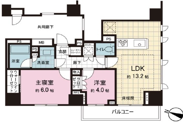 | 間取り | 2LDK (洋室6畳、洋室4畳、LDK13.2畳) | ||