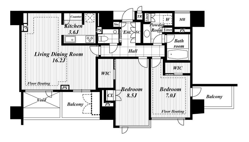 | 間取り | 2LDK (洋室8.5畳、洋室7畳、LDK19.8畳) | ||