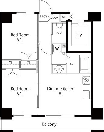 | 間取り | 2DK (洋室5.1畳、洋室5.1畳、DK8畳) | ||