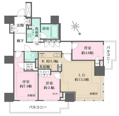 | 間取り | 3LDK (洋室7.4畳、洋室5畳、洋室4.6畳、LDK16.8畳) | ||