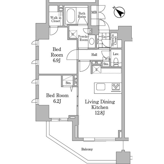 | 間取り | 2LDK (洋室6.9畳、洋室6.2畳、LDK12.8畳) | ||